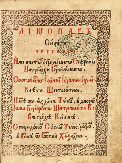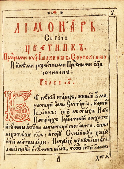 Лiмонаръ сирѣчъ цвѣтникъ иже въ ст҃ы҄х оц҃а нашегѡ Софронїа Патрїархи Іерс҄лимскаго. Составлен же Іоанном Іеромонахомъ . в лѣто шестьсотное. – [Киев], 1628. – 380 с. [20 см.]