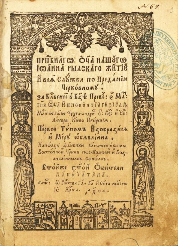 Най-старато печатно изднаие на жититието и службата (19.Х) на св. Йоан Рилски. Изданието е направено в Киево-Печерскта лавра (Киев, Украйна).