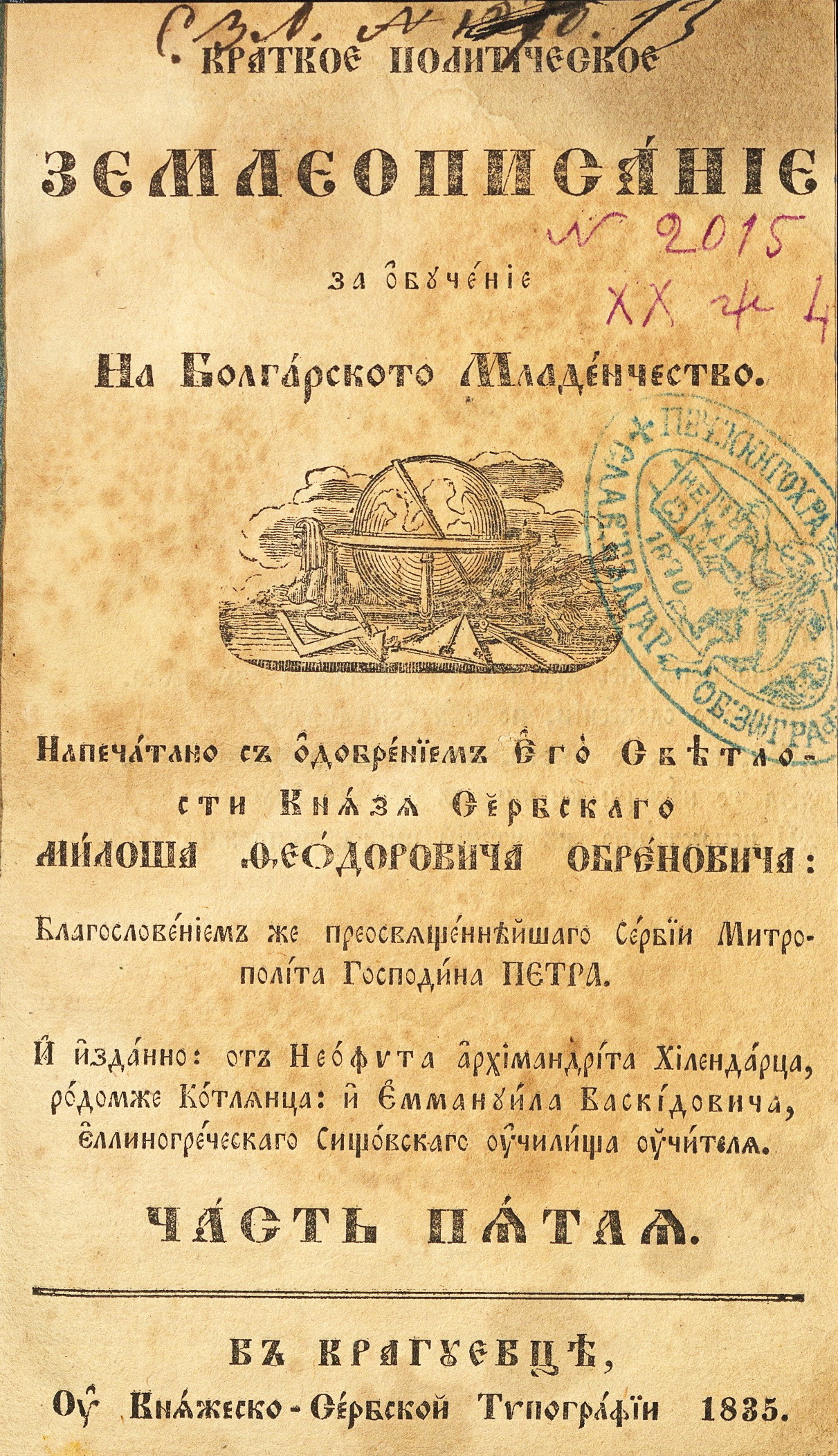 Краткое политіческое землеописаніе за обՃченїе на болгарското младенчество. Напечатано съ одобренїемъ его свѣтлости кнѧзѧ сербскаго Милоша Ѳеодоровича Обреновича: Благословеніемъ же преосвѧщеннѣйшаго Сербїи митрополїта господина Петра. И издано: отъ Неофѵта архімандріта Хілендарца, родом же Котлѧнца : и Емманճила Васкідовича, еллиногреческаго Сищовскаго ѹчилища ѹчителѧ. Часть пѧтаѧ. – Крагуевац, 91+3 с., ил.; 18 см.
