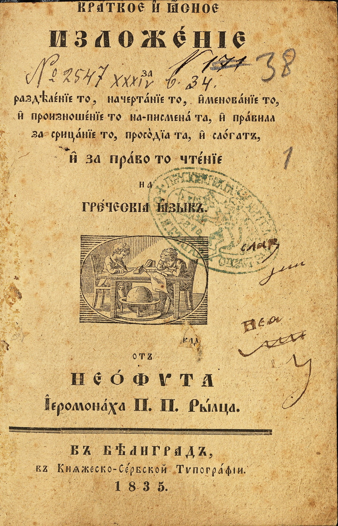 Краткое и іасное изложеніе за раздѣленїе то, начертанїе то, именованїе то, и произношенїе то на-писмена та, и правила за срицанїе то, просодїа та, и слогатъ и за право то чтенїе на греческіа іазыкъ отъ Неофѷта іеромонаха П. П. Рылца. Въ Бѣлиградъ, в Кнѧжеско-Сербской Тѵпографии 1835. – Белград, 1835. – І-VІІІ + 9-36 с., 18 см.