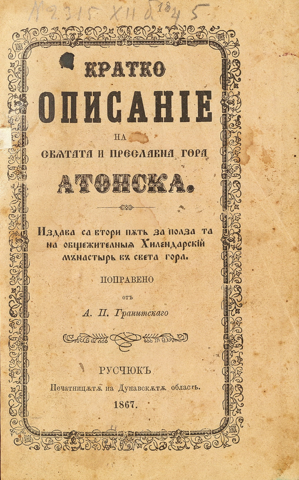 Кратко описаніе на Свѧтата и преславна гора Атонска. Издава са втори пѫтъ за полза та на общежителныѧ Хилендарскый мънастырь въ Света гора. Поправено отъ А. П. Гранитскаго. Русчюкъ. Печатницѫтѫ на Дунавскѫтѫ область. – Второ изд. – Русе, 1867, 71 с. ; 20 см.