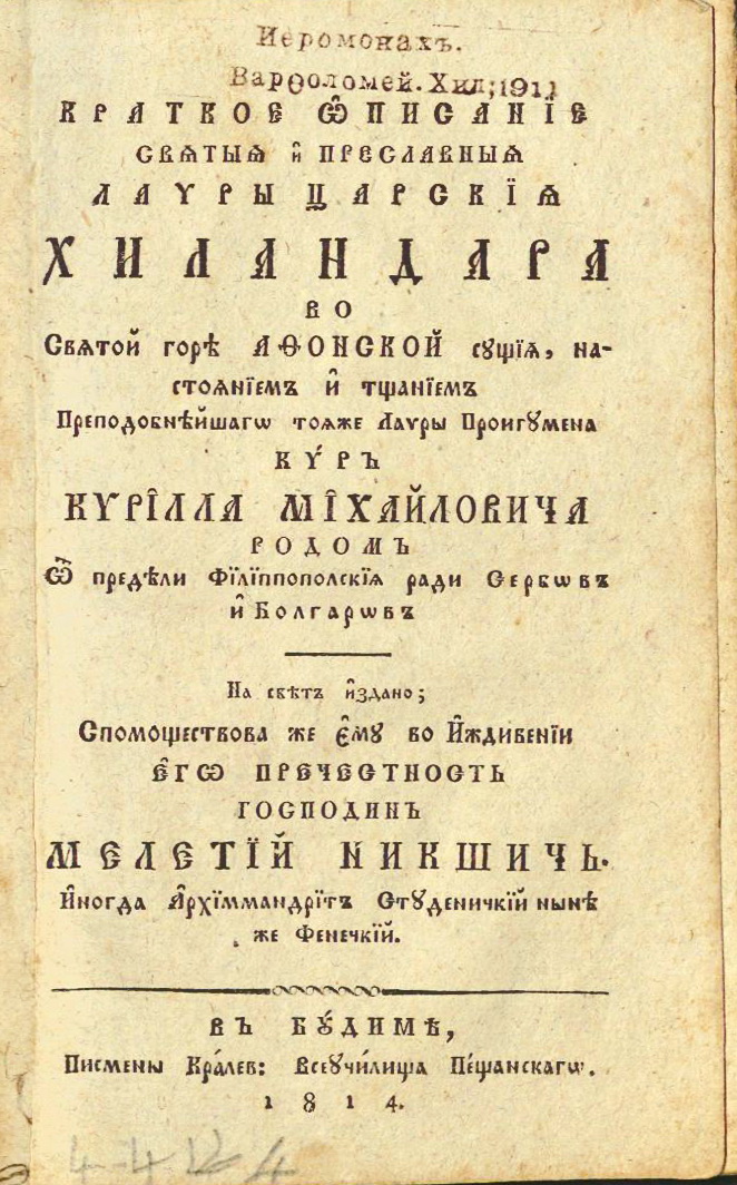 Краткое ώписанiе Свѧтыѧ и преславныѧ Лаvры царскiя Хиландара во Свѧтой горѣ Аθонской сущиѧ / настоѧнiем и тщанiем Преподобнѣйшагω тоѧже Лаvри проигумена кvръ Кирiлла Мiхайловича родомъ ωт предѣли Фiлiппополскiѧ ради сербωвъ и болгарωвъ. -Будапеща, 1814, 31 с.; 19 см.