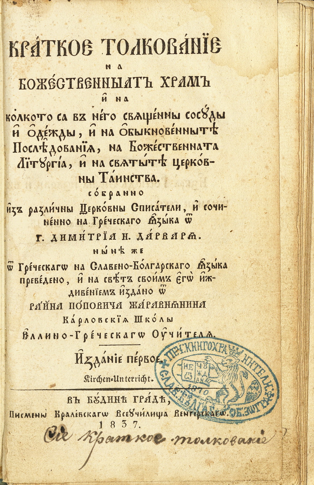 Краткое толкованїе на Божественныатъ храмъ и на колкото са въ него свѧщенны сосՃды и одежды, и на обыкновеннытѣ послѣдованіѧ, на Божественната лїтՃргіа, и на свѧтытѣ церковны Таинства. Собрано изъ различны Церковны Списатели, и сочиненно на Греческаго ѧзыка ѿ Г. Димитрїа Н. Дарварѧ. Нынѣ же ѿ Греческагѡ на Славено-Болгарскаго ѧзыка преведено, и на свѣтъ своимъ егѡ иждивенїемъ издано ѿ Райна Поповича Жаравнѧнина Карловскїѧ Школы Еллино-Греческагѡ Оучителѧ. Изданіе первое. -Будине граде, 1837. -108 + [2], ил; 19 см.