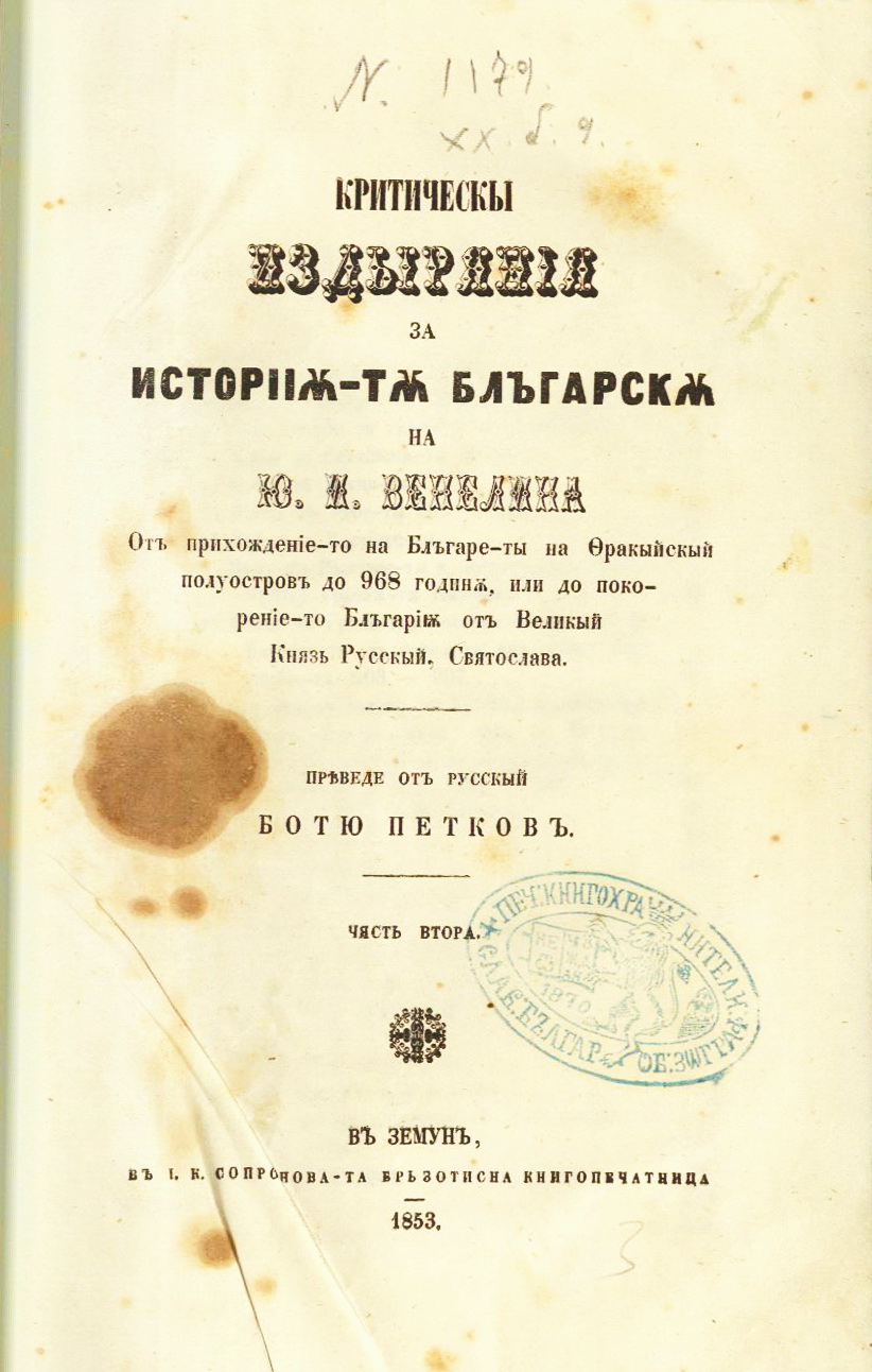 Критическы издырянія за историяѫ-тѫ блъгарскѫ на Ю. И. Венелина: Отъ прихожданіе-то на Блъгаре-ты на Ѳракыйскый полуостровъ до 968 годинѫ, или до покореніе-то Блъгаріѫ от Великый Князь Русскый, Святослава: чяст втора. – Земун, 1853, 4+204+16 с.; 26 см.