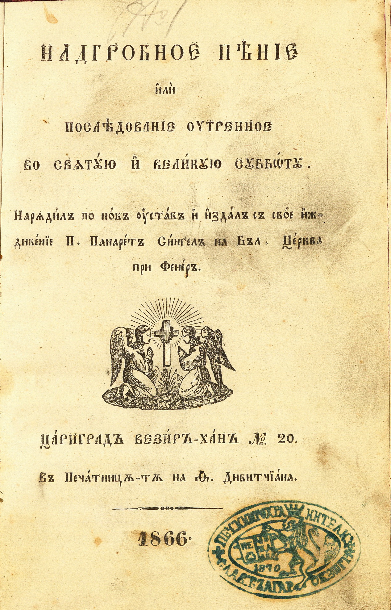 Надгробное пѣніе или Послѣдованіе ѹтренное во свѧтѹю и Великѹю сѹббѡтѹ. – Цариград, 1866. – 40 с.; 21 см.
