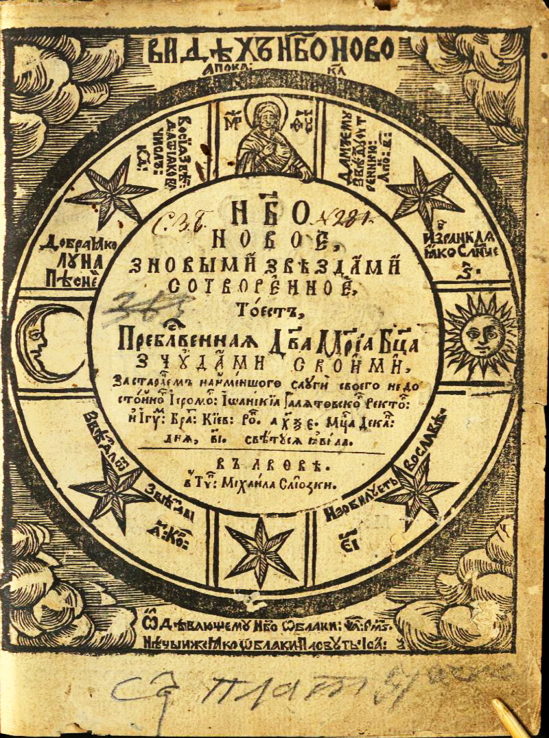 Небо новое, з новыми звѣздами сотворенное, тоестъ, Преблагословеннаѧ Дева Маріа Богородица з чՃдами своими, за старанемъ найменшого слՃги своего недостойного Іеромон: Іѡанікїа Галѧтовского ректора и Ігумена Бра: Кїев: Ро: ахѯе. Мца Дека: днѧ ві. свѣтՃсѧ ıавила. – Лвов, 1665. – 312 с., ил.; 20 см.