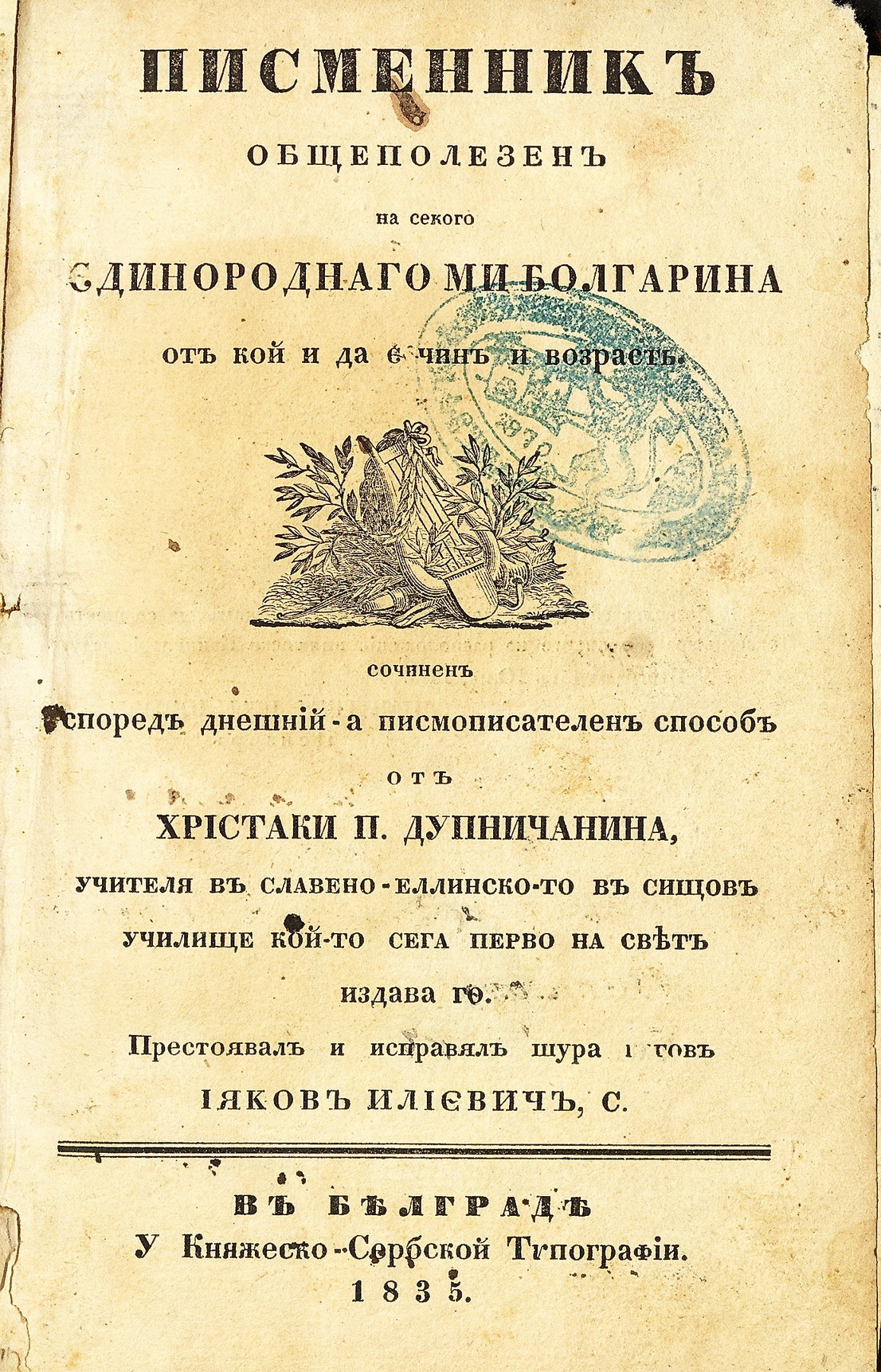 Писменникъ общеполезенъ на секого единороднаго ми болгарина отъ кой и да е чинъ и возрастъ : сочиненъ споредъ днешній-а писмописателенъ способъ отъ Хрістаки П. Дупничанина, учителя въ славено-еллинско-то въ Сищовъ училище кой-то сега перво на свѣтъ издава го. Престоявалъ и изправялъ шура неговъ Іяковъ Иліевичъ, С. Въ Бѣлиградѣ у Кнѧжеско-Сербской Тѵпографіи 1835. – Белград, 1835. – 78 + [6] с.; 18 см.