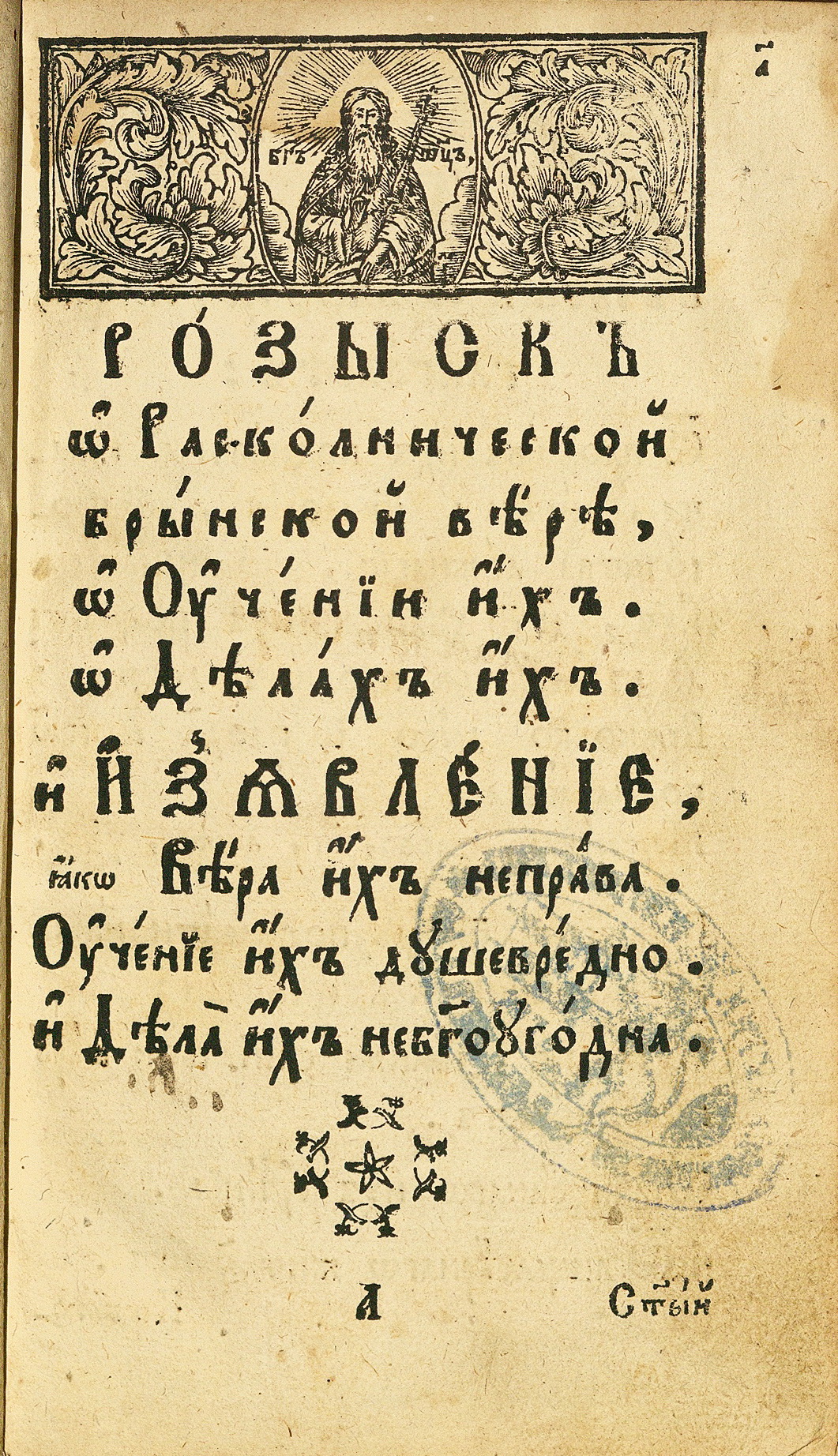Розыскъ ѡ расколнической брынской вѣрѣ , ѡ ѹченїи ихъ . ѡ дѣлахъ ихъ . и изѧвленїе , іакѡ вѣра ихъ неправа . ѹченїе ихъ дճшевредно . и дѣла ихъ небг҃оճгодна. – Киев, 1748. – 1102 с., ил.; 16 см.